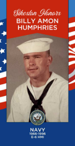 Billy Amon Humphries joined the United States Navy Reserve in 1966. He served until 1996 achieving the rank of E-6 (POI - HMI). He completed Boot Camp at Great Lakes Hospital Corps School in San Diego. He attended the Field Medical Service School at the Camp Pendleton Hospital was assigned duty to the Naval Hospital in Beaufort, SC. Billy served in the 9th Marine Amphibious Brigade in Vietnam and Okinawa. He served in active duty from June 7, 1967 - October 10, 1969. He retired from the Naval Reserves. After his military service he was Twice Commander of the VFW Post 3838, Chaplain in Marine Corps League, and Optimist Club President for 1 year. His Decorations and Commendations include the Cross of Gallantry with Palm, National Service Defense Medal, Vietnam Service Medal, Fleet Marine Force Combat Operation Insignia, and Combat Action Ribbon.