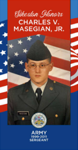 Charles Masegian, Jr. enlisted in the United States Army in 1999 while in high school. He served for 12 years until 2011. He achieved the rank of Sergeant. During his service he was deployed to Iraq from 2004-2005 with the Missouri Army National Guard 1140th Combat Engineering Battalion Company C to conduct Operation Iraqi Freedom. From 2009-2010 Sgt. Masegian was deployed overseas once again to Afghanistan, where he volunteered his service to carry out Operation Enduring Freedom as an MP with the 1140th. He was awarded several honors including the Afghanistan Campaign Medal, Campaign Star, Army Commendation Medal, Army Achievement Medal, Meritorious Unit Commendation, 2 Army Good Conduct Medals, 3 Army Reserve Components Achievement Medals, National Defense Service Medal, Global War on Terrorism Service Medal, Non-Commissioned Officer Professional Development Ribbon, 2 Army Service Ribbons, Army Reserve Component Overseas Training Ribbon, 3 Armed Forces Reserve Medals, and NATO Medal.