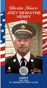 Joey D. Henry served in the United States Army from 1981-2001. He achieved the rank of Sergeant First Class E-7. Joey completed his Basic Combat Training at Fort Leanard Wood, Missouri. He excelled at various prestigious roles at Fort Polk, LA, and Kaiserslautern, Germany. He was awarded numerous honors including 5 United States Army Accommodation Medals, 5 United States Achievement Medals, Meritorious Service Medal, 6 Army Good Conduct Medals, National Defense Service Medal, Noncommisioned Officer's Professional Development Ribbon, 3 Overseas Service Ribbons, Expert Marksmanship Badge with Automatic Rifle Bar. Joey would complete the Primary Leadership Development Course and the Ordnance Advanced Noncommissioned Officer Course. His 20-year service was an inspiration to others. Joey retired from the military on Septemner 14, 2001.