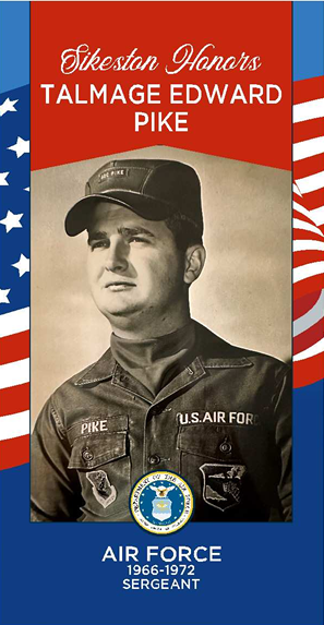 Talmage Edward Pike received a draft notice in late 1965 from the US Army. He chose to join the United States Air Force instead. He completed basic training at Lackland Air Force Base in San Antonio, TX. After basic training, he spent 12 months at Keesler attending "Radio Relay" Microwave Communications Equipment repair school. After graduation he was assignment to Offutt Air Force Base in Omaha, NE to the 32nd Communications Squadron which was the Communications System for the Strategic Air Command "Underground" Headquarters. His duty site was 70 miles northwest of Offutt, in a corn field called "Scribner AFB" a world-wide transmitter site for the Strategic Air Command. They had B-52's in the air 24-7 with weapons loads and designated targets. Scribner provided communications with all aerial assets. After serving in Scribner, he was assigned to the 5th Tactical Control Group in Vietnam, Thailand, and Korea. After his service in Vietnam, he was sent to South Korea after North Korea had shot down a US plane and captured the "USS Pueblo". He was sent to Palgonson Mountain to set up another communication site near the Korean DMZ. After 6 weeks he returned to Clark AFB in the Philippines. Upon completing his tour at Clark AFB, he returned to the US and was discharged at Travis AFB in California. He has been a resident of Sikeston ever since. He received the following awards and citations: Outstanding Unit Citation, National Defense Ribbon, Vietnam Service Ribbon, Vietnam Campaign Ribbon, Armed Forces Expeditionary Ribbon, Small Arms Expert Ribbon and USAF Good Conduct Ribbon.